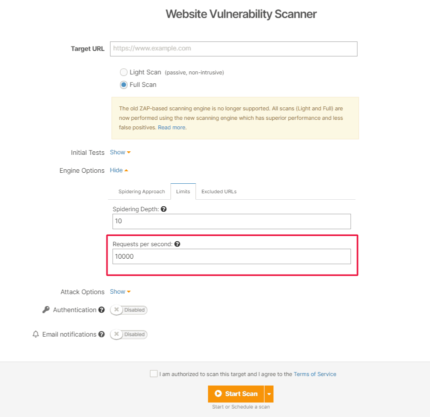 Go to Website Vulnerability Scanner, add your URL target, select Engine options, and choose Limits. From there, you can set a maximum of 10.000 requests/second.