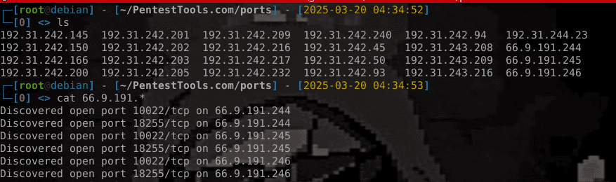 • 3 servers on the range 66.9.191.0/22 with the same two unusual ports open: 10022, 18255