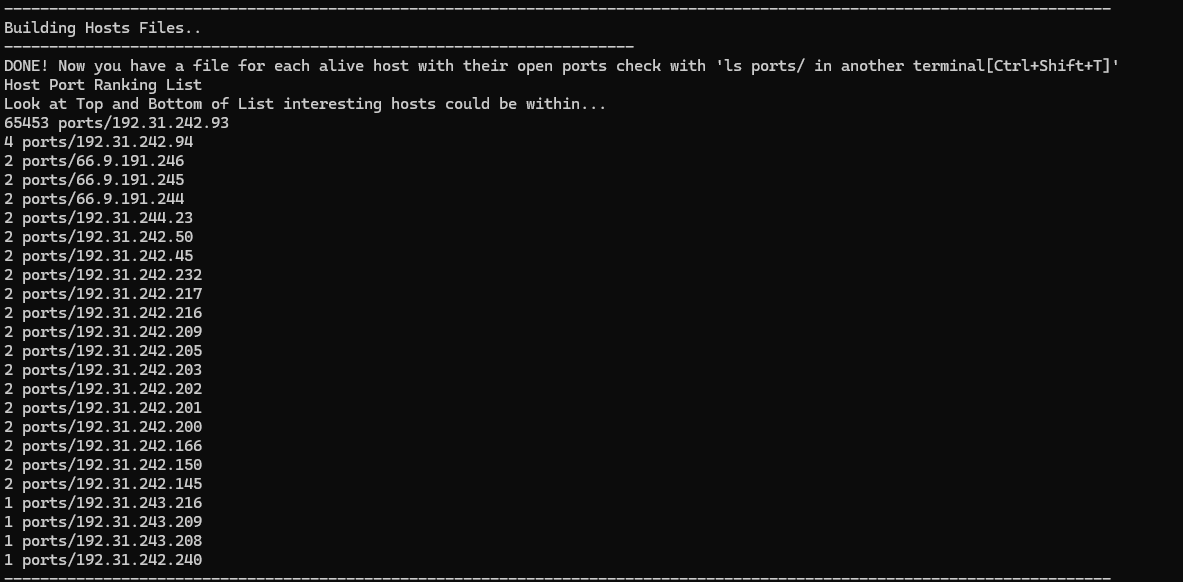 We'll find these ports in the '/ports' directory created by BIGF00T.sh, and we'll group them by IP/IP range based on our 'Top Port Ranking list' analysis.