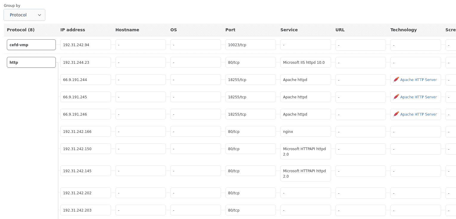 By sorting by 'Technology,' we can see that Apache servers are specifically used on the network infrastructure nodes we previously identified: 66.9.191.244, 66.9.191.245, 66.9.191.246, and 192.31.242.94.