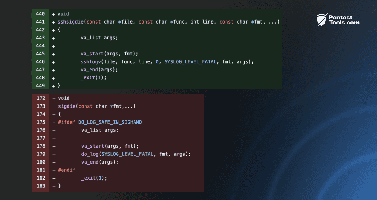 • OpenSSH 8.5p1 through 9.8p1 is vulnerable again to this signal handler race condition (because the "#ifdef DO_LOG_SAFE_IN_SIGHAND" was accidentally removed from sigdie()).
