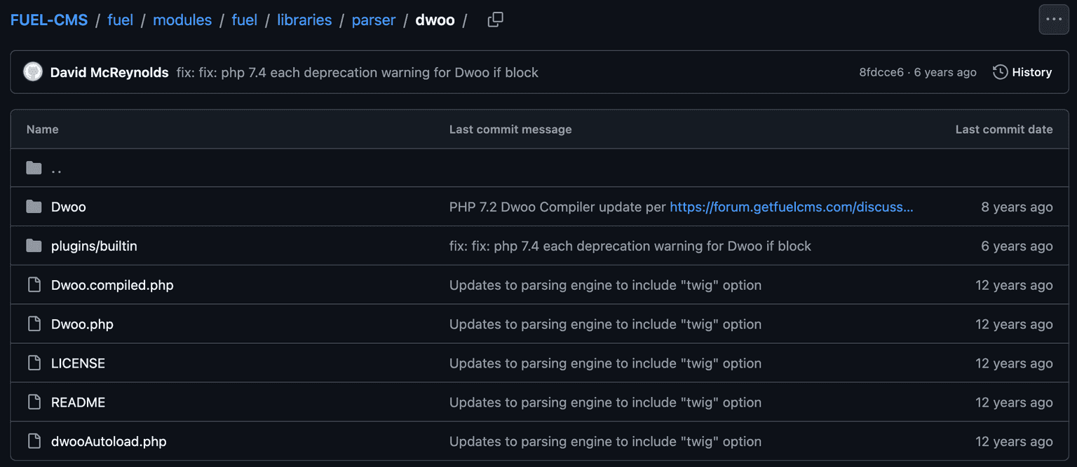 However, the surprising part is: why does FuelCMS use a 12 year old version of Dwoo, not even the latest version of the Unmaintained software that was last updated 8 years ago?