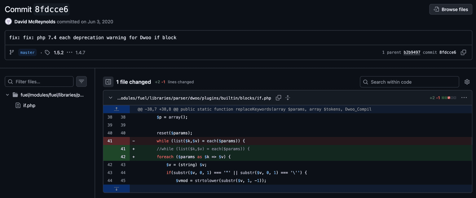 And, yes, some of the more observant among you may be going “Umm, actually FuelCMS updated their version of Dwoo 6 years ago, not 12” … and, well, judging by the fact they only modified a while into a foreach, I don’t think it fixes ANYTHING.